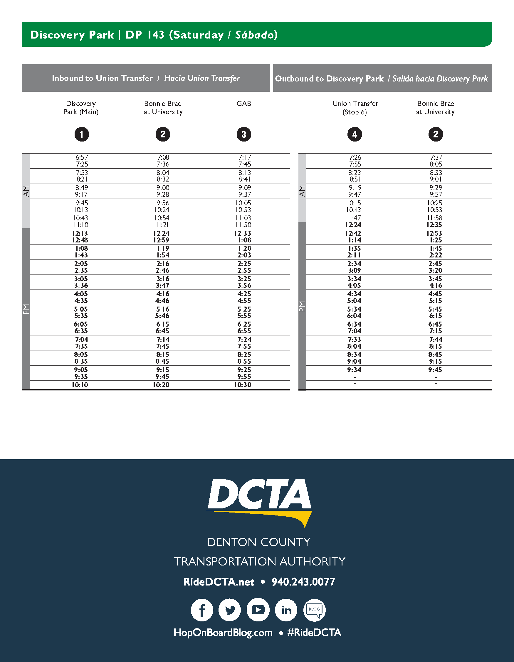 Students, faculty and staff of the University of North Texas can ride the following DCTA services for free by presenting their UNT identification cards: