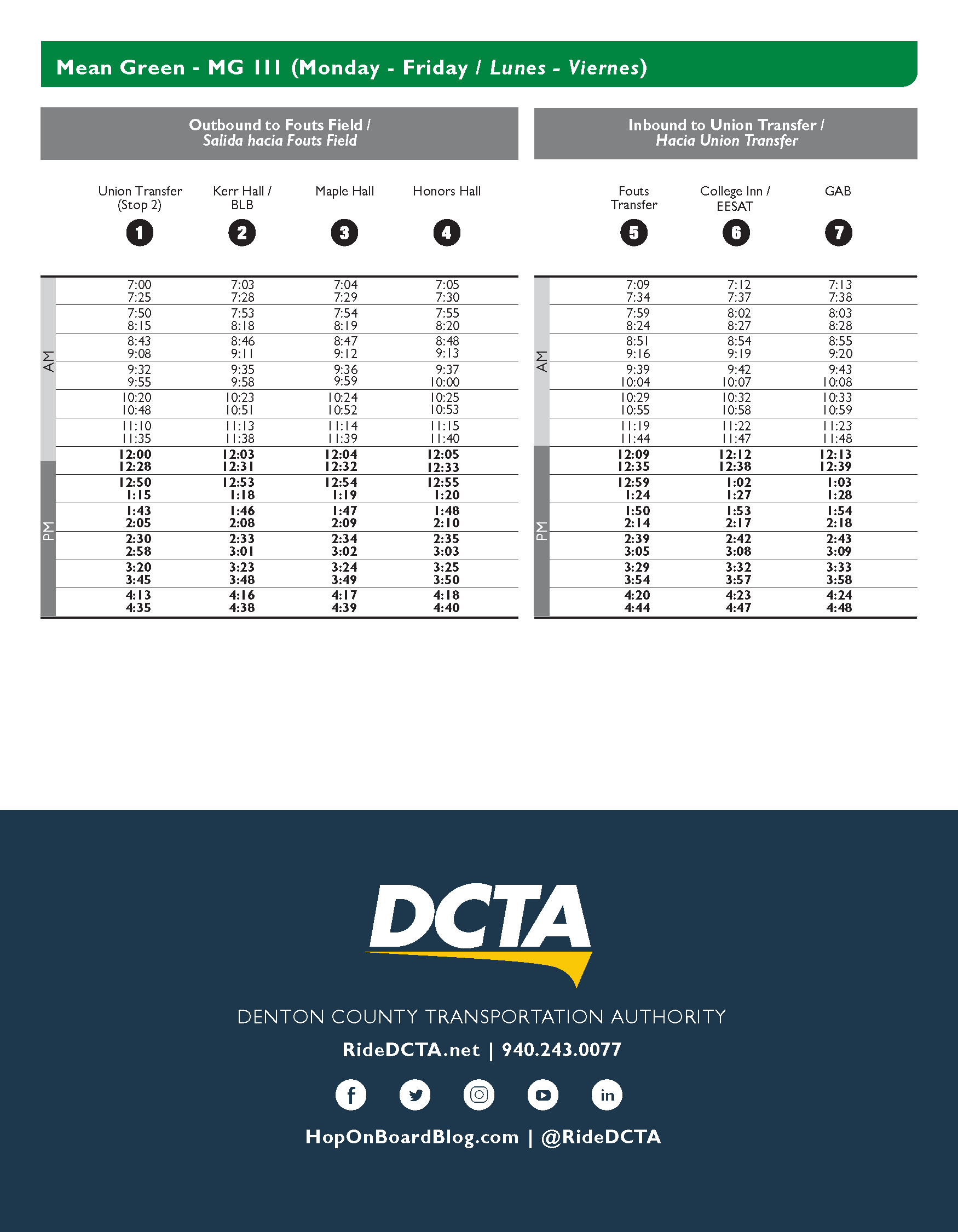 The UNT Campus Shuttle is a DCTA service offered in partnership with the University of North Texas (UNT) to provide direct shuttle service to the campus and off campus student-oriented housing.